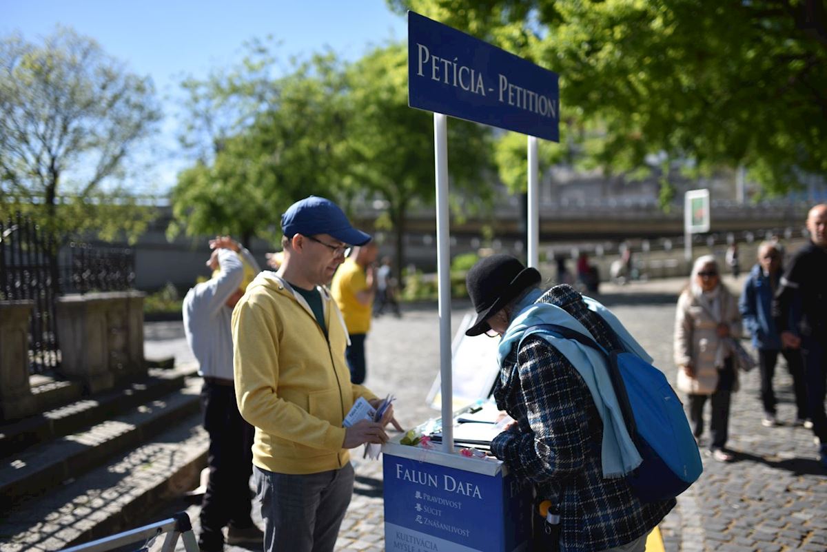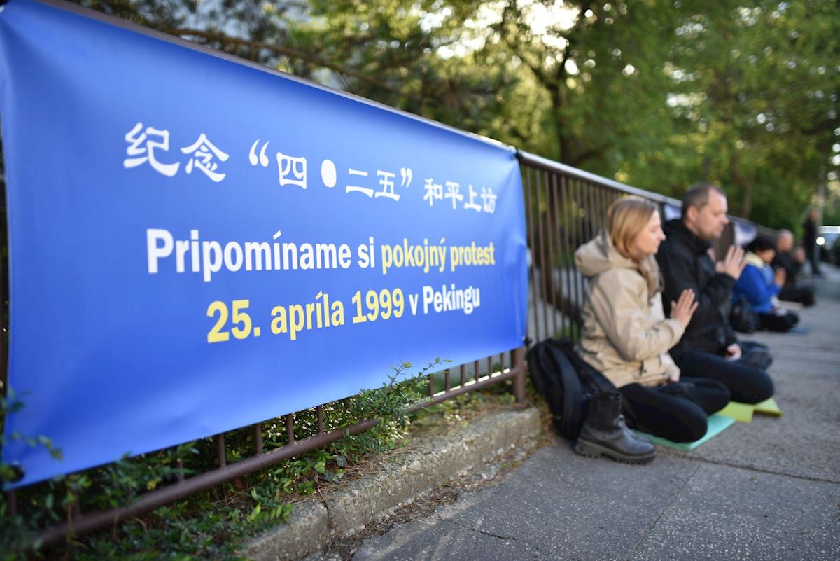 她所提到的和平抗议,是发生在二十七年前,一九九九年法轮功学员四·二五上访。从那时起,世界各地的法轮功学员每年都会在四月二十五日前后举行和平的纪念活动,向中国学员的勇气与善良致敬。今年,斯洛伐克学员在布拉迪斯拉(Bratislava)发举办了两场活动。第一个活动于四月二十三日在中国大使馆外举行,第二个活动于四月二十六日在多瑙河广场举行。