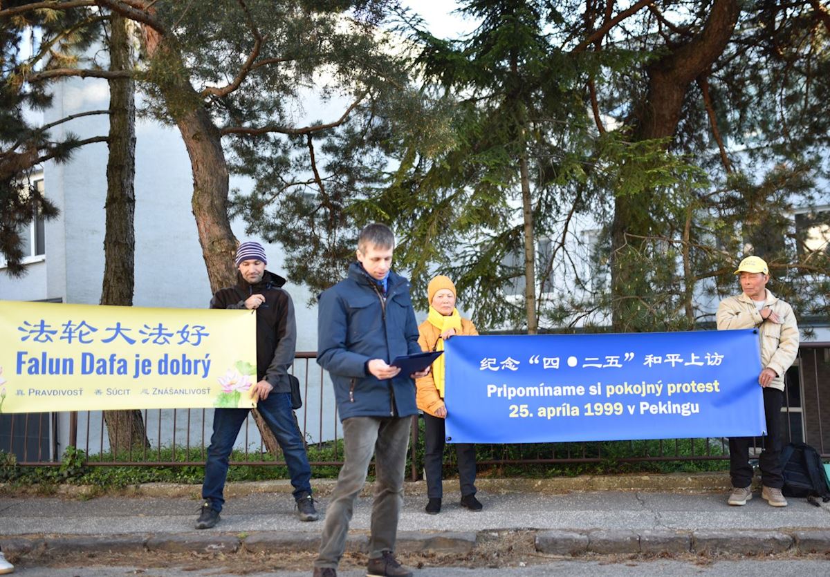 四月二十三日,斯洛伐克法轮大法学会负责人马雷克·塔塔尔科(Marek Tatarko)在中国大使馆外的活动上发言,介绍了这次和平上访及学员们提出的诉求。