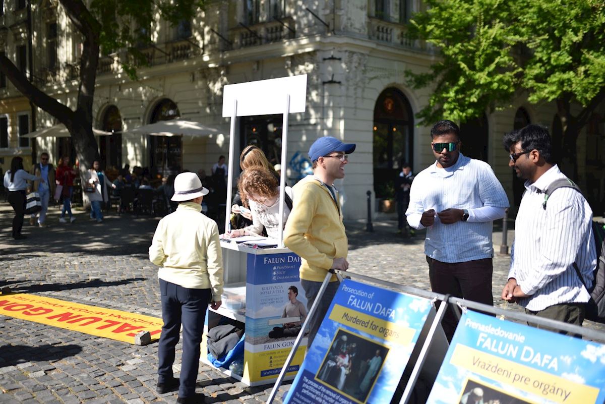 三天后的四月二十六日(星期日)下午,法轮功学员在布拉迪斯拉发多瑙河广场举办了信息日与征签活动,向公众讲述法轮功受迫害情况,同时还展示法轮功功法并征集反迫害签名。许多人在请愿书上签名,并表达了对北京四·二五和平上访的看法。