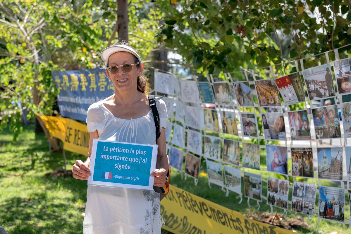 维罗妮卡·霍阿罗(Véronique Hoarau)女士原本打算去附近的集市,但最终没有去,而是留在展位上多停留一会儿。她被现场温馨友好的氛围所打动,与修炼者进行了长时间的交谈。得知留尼汪岛上设有炼功点,其中一个就在她女儿家附近,她感到非常高兴,并表示希望学习法轮大法。此外,她还签署了反对强迫摘取器官的请愿书。