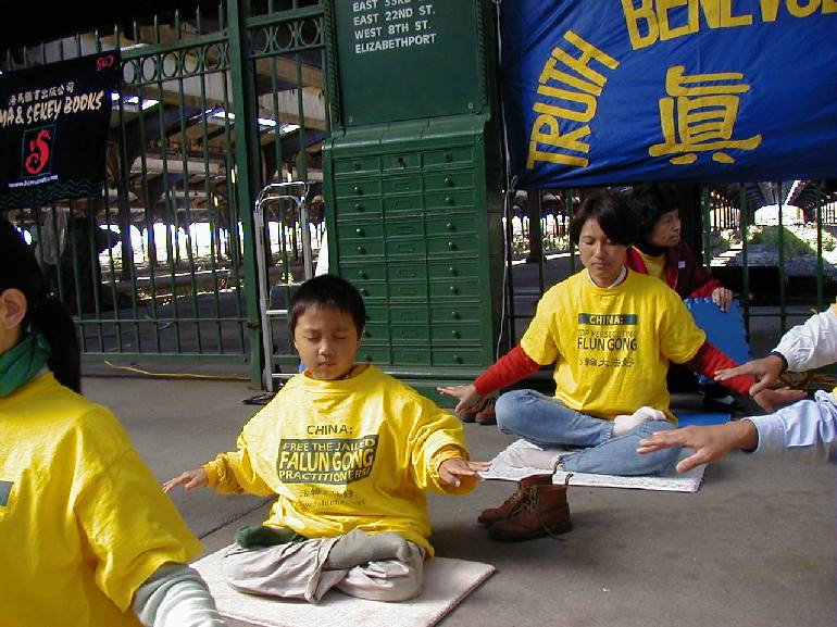 来自新州的五十多名法轮大法学员身着黄色炼功服和黄T恤衫进行了一整天的功法表演和洪法及向世人讲明真相的活动。 “新州中国日”的举行地点恰在公园最繁华的通往自由女神岛的码头旁。大厅内,参加节日者人头攒动,大厅外,来往游人络绎不绝。真是极好的洪法机会。 一、室内洪法见闻 大厅内,拥有两个展位的法轮大法展台后面高悬中英文的“真善忍”和“法轮大法”的横幅。展台上整齐地摆放着中英文大法书籍和教功带以及丰富的中英文洪法和讲明真相的资料。电视里不断地播放着“法轮功”教功带和“法轮大法在台湾”录像。展台前摆放着法轮大法在世界洪传和法轮功学员在中国受迫害的彩色图片板,吸引了众多的人前来观看。 学员们十人左右一组不断地演炼着五套功法。四、五位学员在展台前向人们发放资料、介绍大法并耐心地解释人们提出来的各种问题。有不少人当场买了《转法轮》和教功录像带。有的学员怀着一片善心,向每一个展位赠送了大法资料。 一位从大陆来美探亲的中年妇女看到学员们炼功的宁静祥和的场面之后,不由地停下步来问一位学员:“你们还在炼呀?大陆可都不许炼了!”学员回答说:“法轮功在全世界几十个国家洪传,受到各国人们广泛一致的好评,学炼的人越来越多。”学员还回答了她所疑惑的问题。最后她拿了资料,笑容满面地同学员道别,满意离去。我们真为她高兴,又一个被蒙蔽的善良人澄清了思想,获得了正确的认识。 有一位妇女和学员聊了很长时间,方方面面问了许多问题。她说,她正在读《转法轮》这本书,已经读了一半。她准备读完书再来看看自己学不学。这时学员提醒她,一定要一气读下去,直到全部读完一遍。如果半途停下来,可能就会有各种原因使你想不起来再读下去了。她表示自己一定会读完。她说,从她读过的这部分,她已经清清楚楚地知道这完全是一部教人做好人的书。学员又讲述了自己,家人及功友修炼法轮功后身心受到巨大益处,举了许多生动有力的事例。 有一对大陆来的但讲不好普通话的老夫妇,在炼功的学员面前站立良久,一直目不转睛地注视着。一位学员上前与他们交谈,老两口对法轮功教人真修向善的真谛心领神会。当学员说到大法洪传,无数的修炼者身心受益时,老先生立刻指着手中大法报纸上真善忍三个字连连微笑点头,学员从他的脸上读到了这位老先生的心声。是啊,叫人修真善忍的功法能不是最好的功法吗?能不得到最广大的善良人们的拥护和喜爱吗? 有一位从上海来的五十多岁的游客对我们学员说,在大陆,他周围炼法轮功的都是非常非常好的人,所以他根本不相信政府的欺骗宣传。他知道法轮功好。他真不明白为什么政府要镇压这么好的功法,迫害这么好的人群。他说他也很想学炼,可是自己还得回大陆,因此他又很害怕去炼。。。听到这儿,我们真为那些被中国政府中某些残暴镇压法轮功的人剥夺了修炼权利的善良人们感到痛心。他们中间可能有许多是有缘人,可是却因此而失去了机缘。江泽民之流犯下的罪业真是深重如山!学员建议他一定要认真地读一读《转法轮》这本书,这位学员诚恳地对他说:“我们今生今世能读到李老师这本书,真的是我们非常非常大的福分,千万不要错过这千古不遇,万古不遇的珍贵机缘。读了书,也许你就知道自己下一步该怎么做了。” 两位中国男青年在法轮大法的摊位前观看着电视里放送的李老师教功和讲法录像,其中一位感慨地对另一位说:这就是李大师!真不可思议!XX党喊了那么多年光荣啊,伟大呀,人们也不把它当回事。法轮功几年里使世界上那么多的人信服,中国镇压的那么凶人们仍然信服,真不可思议! 一位黑人青年,在了解了法轮大法的情况后,主动询问在自己家附近是否有炼功点,表示向参加炼功。当被介绍与当地炼功点电话联系后,高兴的拿着法轮大法的介绍材料走了。 一位非裔男士坚持要买一件法轮功黄T恤 。问他为什么对我们穿的黄T恤那么有兴趣,他说他已经关注法轮功多时,一直想要一件黄T恤作为纪念. 两位女士在仔细观看着学员们演示功法动作,然后说:他们真平和啊!他们哪象反政府的人呢?另一位男士在旁边说:我怎么也不理解为什么中国政府要镇压他们! 一位父亲带着8、9岁的女儿来到法轮大法摊位前,说早已听说过法轮功,知道他是非常好的功法,并问像女儿这样年龄的孩子能否炼功。当被告知有很多同龄的孩子在炼法轮功并且炼的非常好时,父亲表示也要让女儿炼,女儿同时也甜甜地笑了。 一对老夫妇看到学员功法演示,询问说:我都七十岁了,还能炼功吗?学员告诉说,在中国大陆,年龄最大的法轮大法学员九十多岁,您还是年轻的呢!他们高兴地说:今天太好了!我们真有幸和你们聊聊,你们使我们有了信心。 中午,当学员被残害的图片板一摆出,人们便围观上来认真地阅读起来。一位华人女士拉过先生看着迫害照片并对先生说:“看,他们遭受这样的毒打。”一位年迈华人先生对一位学员说:“江泽民太邪恶了,他长久不了。” 一位白人女士领着一个5、6岁的小男孩看着图片板,母亲指着一组儿童炼功的照片对着孩子说:看,他们在炼功,和你大小差不多。小孩手指着一幅天安门广场上两个警察在拖着一位盘腿打坐的学员的照片,问妈妈:他们在干什么?妈妈感慨地回答说:中国警察不让他炼。看完图片后,这位