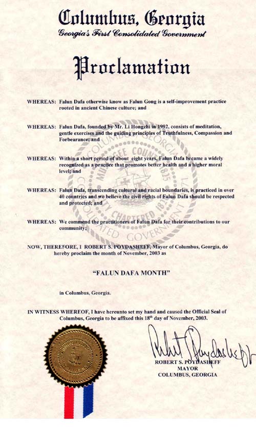 | 【明慧网2003年12月24日讯】 鉴于,法轮大法,又称法轮功,是基于古老中国文化的自我提高的功法;并且 鉴于, 法轮大法包括打坐、缓慢动作和真善忍原理,由李洪志先生于1992年传出;并且 鉴于,在大约短短的8年时间里,法轮大法成为众所周知的功法,他提倡健康的身体和更高的道德标准;并且 鉴于,法轮大法超越文化和种族界限,在40多个国家洪传,同时我们相信法轮大法学员的民权必须受到尊敬和保护;并且 鉴于,我们对法轮大法学员对我们社区做出的贡献表示赞赏; 现在,所以,我,罗伯特-波伊德雪夫(Robert S. Poydasheff),乔治亚州哥伦布市长,在此褒奖2003年11月为乔治亚州哥伦布市 “法轮大法月”我于公元2003年11月18日在本文件上签字并加哥伦布市公章,以此为证。 (签名) 罗伯特-波伊德雪夫(Robert S. Poydasheff) 乔治亚州哥伦布市市长   |