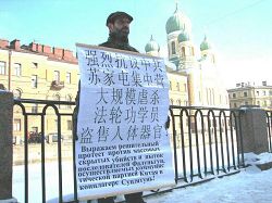 | 【明慧网2006年4月10日】俄罗斯法轮功学员连日来在莫斯科中使馆和圣彼得堡中领馆前抗议中共大规模秘密虐杀法轮功学员的法西斯暴行。学员们打着中、俄文的“强烈抗议中共集中营大规模秘密杀害法轮功学员!”“中共杀人营焚尸灭迹、售人体器官,天理难容!”的标语牌,在中使、领馆前曝光中共江罗集团残酷迫害法轮功的惊天罪恶。 这是一组照片,法轮功学员根据俄罗斯法律允许,单个人举牌抗议不用申批的规定,举行接力抗议活动。  莫斯科中使馆前接力抗议 |