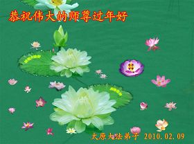 【明慧网二零一零年二月十四日】北京朝阳区酒仙桥地区全体大法弟子向伟大的师尊致以最崇高的敬意!在这新年之际,我们怀着无比真挚的心向伟大的师尊致以最崇高的敬意! 历史又迈進新的一年,使我们深深的感到正法洪势的突飞猛進。我们要更加精進抓紧时间,多学法,学好法,在修好自己的同时,圆容好整体,做好三件事,尽快成熟起来。 完成我们的史前大愿,稳健的走好师尊安排的每一步。 北京朝阳区酒仙桥地区全体大法弟子跪拜。 2010年2月9日 北京大法弟子恭祝师父新年快乐!河北沧州大法弟子向师尊拜年!北京海淀学法小组恭贺师父新年好!黑龙江省宾县资料点大法弟子敬祝师尊新年好!山东济南地区一学法小组全体大法弟子向师尊拜年!沐浴佛光, 天清体透。 慈悲精進, 世人觉醒。 山东济南地区一学法小组 全体大法弟子叩拜 天津市红桥区、河西区、南开区、河北区、北辰区、河东区、开发区大法弟子恭祝师尊过年好!北京丰台区一大法弟子恭祝师父过年好!河北唐山乐亭县大法弟子恭祝慈悲伟大的师父过年好!保定新市区全体大法弟子恭祝师尊过年好!我们想念您啊!我们要抓紧时间修自己、救度众生、做好三件事,兑现我们的史前大愿。早日见到师父,跟随师父回家。 大同大法弟子恭祝师尊新年快乐!北京丰台区洋桥大法弟子恭祝师尊过年好!河北井陉县全体大法弟子恭祝师父过年好!山西临汾全体大法弟子恭祝慈悲伟大的师尊新年快乐!太原全家大法弟子恭祝师尊过年好!太原大法弟子恭祝师尊过年好!太原大法弟子恭祝师尊过年好!天津市大法弟子们恭祝师父新年快乐!河北省滦南县大法弟子恭祝师父过年好!走过青涩,走过迷惘,走过幼稚,在您的精心呵护下,一步一步走向成熟。师父啊师父!弟子们的一切都是师父赋予的,宇宙的无量众生在主佛的洪恩浩荡下才有了重生的机缘。师父为弟子所做的一切,弟子都无以为报,只能要求自己在新的一年里更加精進,让师父为弟子们少操一份心。有师在有法在我们相信我们终究最后能做好。请师父放心! 河北曲周全体大法弟子恭祝师尊过年好!天津大法弟子祝师尊新年快乐!天津市南开区大法弟子敬祝慈悲伟大的师尊新年快乐!天津市河东区大法弟子恭祝师尊新年快乐!天津市大法弟子感谢师尊的慈悲苦度!在新的一年里更加勇猛精進! 北京市海淀、西城大法弟子恭祝师尊新年快乐!河北三河全体大法弟子祝师尊过年好!己丑年即将过去,师父辛苦了,大陆大法弟子想念您。在新的一年里,我们会更加成熟、理智,以法为师,更加自觉主动的做好三件事,跟上正法進程,救度更多众生,请师尊放心! 廊坊全体大法弟子恭祝师父过年好!天津大法弟子恭祝师父过年好!秦皇岛一学法小组恭祝师尊新年快乐!请师父放心,我们一定走正走好最后的路。 通辽市全体大法弟子恭祝新年快乐!北京房山区全体大法弟子给慈悲伟大的师尊拜年!内蒙古牙克石市大法弟子恭祝师父新年快乐!呼和浩特新城区大法弟子恭祝慈悲师尊新年好!承德大法弟子恭祝师尊过年好!天津南开区大法弟子恭祝慈悲伟大的师尊新年快乐!唐山古冶全体大法弟子恭祝伟大的师尊新年好!唐山古冶大法弟子恭祝慈悲伟大的师尊新年快乐!河北滦县大法弟子恭祝慈悲伟大的师尊新年快乐!衡水全体大法弟子恭祝师尊过年好!河北省曲周县大法弟子恭祝师尊新年快乐!在新的一年里,我们一定会修好自己,整体配合,救度更多的世人和众生。让师尊少操一份心。 二零一零年二月十一日 在新的一年里,我们一定会修好自己,整体配合,救度更多的世人和众生。让师尊少操一份心。 二零一零年二月十一日 河北省昌黎县全体大法弟子恭祝师尊新年快乐!天津大法弟子恭祝慈悲伟大的师尊新年好!内蒙古呼伦贝尔市扎兰屯全体大法弟子衷心恭祝师父新年快乐!我们会以法为师,做好三件事,助师、助法,再一次恭祝师父新年如意、吉祥! 河北大法弟子恭祝师尊新年快乐!弟子们一定做好三件事,弟子想念师父!北京延庆大法弟子祝伟大师尊新年快乐!石家庄市一家四口大法弟子向师父拜年!师父新年好!河北深州市大法弟子向师父拜年!河北省宁晋县全体大法弟子给师父拜年,祝师父新年快乐!保定大法弟子恭贺伟大的师尊新年快乐!给师父拜年了!保定一大法弟子及全家祝师父新年快乐!北京大法弟子一家四口恭祝慈悲伟大的师尊新年好!在新的一年里,我们一定做好三件事,兑现自己史前的誓约。 太原大法弟子恭祝师尊新年快乐!北京大法弟子恭祝师尊新春快乐!弟子一定努力学法,做好三件事,讲清真相,救度世人,早日跟师父回家! 太原一学法小组弟子恭祝师尊新年好!内蒙古地区大法弟子恭祝师尊过年好!内蒙古根河地区大法弟子恭祝师尊过年好!天津塘沽大法弟子祝师尊新年快乐!师父您好:我们非常想念您,尽管有些正法的事情做的还不十分精進,但我们会努力做好,争取早日和您一起回到我们真正的家园! 塘沽全体大法弟子叩拜 沈阳市一学法小组全体大法弟子恭祝师父过年好!河北围场大法弟子恭贺师尊新年好!弟子一定要更精進,走好最后的路,不负师恩! 辽宁省桓仁满族自治县全体大法弟子恭祝恩师过年好!佳木斯大法弟子恭祝师尊过年好!在新的一年里,弟子要勇猛精進,学好法,做好三件事。救度更多的众生,做好大法弟子应该做的事。请师父放心。 天津和平区大法弟子恭祝师父