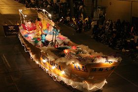 | 【明慧网二零一零年八月三日】二零一零年七月三十一日晚,华盛顿州法轮功学员应邀参加西雅图“炬光”大游行。法轮功学员带来的“大法船”花车再次受到欢迎。七彩祥云的装饰中,身着古装和炼功服的中西方法轮功学员,展示法轮功的五套功法。电视主持人连称法轮大法让人感到“平静”。 美国十大游行之一,西雅图第六十一届海洋节“炬光”大游行(SEAFAIR Torchlight Parade),于二零一零年七月三十一日晚在西雅图市中心二点五英里的道路上举行。沿路人潮摩肩接踵,三十万观众在热闹非常的气氛中庆祝这个被称作“海洋节宝石”的大游行。华盛顿州法轮大法学会第六次应邀参加。  法轮功学员参加西雅图第六十一届海洋节“炬光”大游行 |
