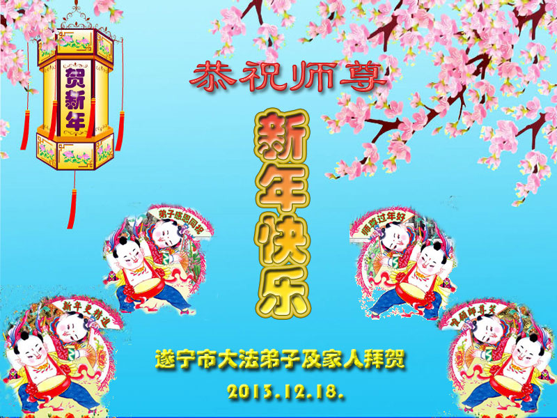 值此元旦、新年即将到来之际,遂宁大法弟子及家人向慈悲伟大的师尊致以元旦、新年的问候!师父新年好!师父您辛苦了!感恩师父一年来的慈悲救度、慈悲加持、慈悲点化!千言万语汇成一句话:恭祝师尊新年快乐!在新的一年里,我们会更加精進,努力做好师尊教诲的三件事,多学法,学好法,遇事向内找,修好自己,多多救人,完成自己的大愿。让师尊多一份欣慰,少一份操劳。再次感恩慈悲伟大的师尊!并附诗一首以示感怀!拜贺师尊! 2014年元旦暨夏历甲午新年感怀 正法推進又一年,得救众生雀跃欢。 感恩师父承大难,众生业债一身担。 感恩师尊救度苦,为救苍生出尘凡。 点化弟子破迷雾,加持弟子闯难关。 延续历史救众生,期盼弟子都圆满。 师笑我笑众生笑,万马齐奔新纪元。 千言万语道不尽,师尊洪恩万代传。 弟子唯有更精進,誓完使命随师还! 四川省达州市开江县一学法小组全体大法弟子遥祝慈悲伟大的师父元旦快乐!