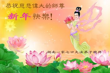 值此新年到来之际,湖南常德市大法弟子恭祝慈悲、伟大的师尊新年好! 又是一个新年, 众生都在期盼, 师尊辛劳苦度, 纯洁莲花满天。 恶人自当恶报, 善良终结善缘, 佛法绝无私念, 金刚不变永远。 弟子感恩师尊, 精進实修不停, 他日圆满回家, 再报救度洪恩。 湖南安化大法弟子恭祝师尊元旦快乐!