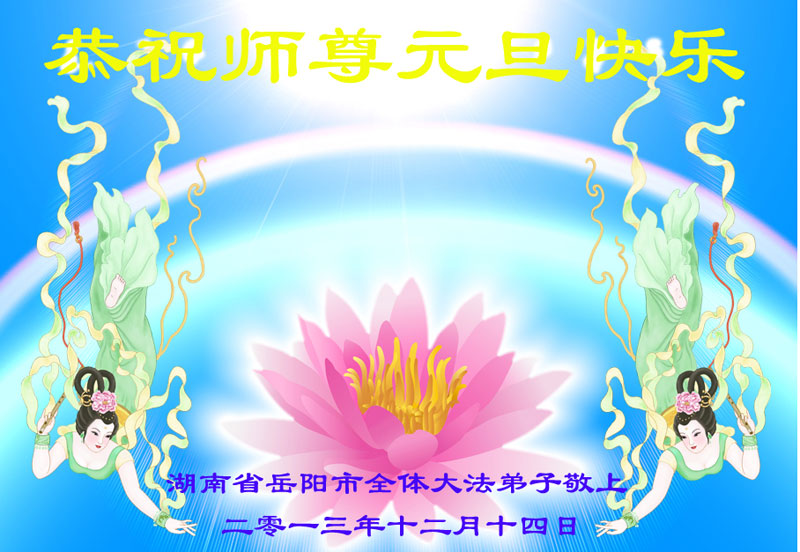 在二零一四年元旦即将来临之际,我们学法小组全体大法弟子向慈悲伟大的师尊问好!弟子们一定不忘师尊的教诲,努力做好“三件事”,不负师尊的慈悲苦度! 岳阳大法弟子祝师父新年快乐!我们一定精進。