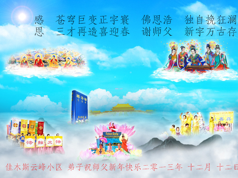 我们紧随师尊度过了一年又一年。谨遵师尊教诲,助师正法越来越成熟!在新的一年里,努力完成史前誓约,决不懈怠,勇猛精進,直至圆满! 出版发行系统全体大法弟子恭贺 二零一三年十二月二十七日 四川省达州市开江县金融系统部份大法弟子敬祝伟大师尊元旦愉快!