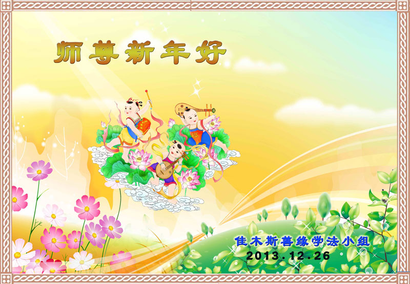 佳木斯大法弟子及家人敬上 二零一三年十二月二十八日 黑龙江省佳木斯西片学法小组四位大法弟子恭祝慈悲伟大的师尊:新年快乐!