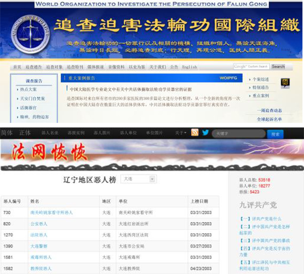 但是法轮功学员们深信乌云无法蔽日,残酷迫害永远无法阻止大法真相和迫害真相的传播。为了众生的未来,法轮功学员们付出了自己能够付出的一切。电视、电台、卫星天线传递的真相,向大连民众揭开了被中共掩盖的罪恶。这些真相带着正义与善良的巨大能量,揭开了中共党媒喉舌夜以继日散布的弥天大谎。 在全球法轮功学员不懈的讲真相之下,越来越多的世人明白了真相,选择了新生。全世界的正义力量开始围剿邪恶,中共红墙将倒。 二、正义审判 中共的存在对所有生活在这片土地上的人们都是威胁。 王海英向我们讲述了一群刚刚成年的孩子的遭遇:“2010年(在马三家劳教所)我快要回家(非法劳教期将满)的时候,突然进来一批特别特别年轻的小孩,她们也就18、9岁,那些小孩,后来说是干什么呢,说是因为传销(被中共警察)抓进来的,然后呢,她们就往家打电话的时候呢,(劳教所)那里面的警察告诉她们说“不要告诉你在劳教所,说你在什么什么学习班”。所以(劳教所)那里面,只要是需要人干活的时候,他们就上外面抓一批人进来。其中那里面有一个工人,说‘这也没人干活了,打电话告诉,抓一批进来’,就是不管你在外面触没触犯法律,都会把你抓进来,为那里面干活,为那里面赚钱,就这样。” 中共的法律只是摆设,是针对百姓制定的,是用来镇压百姓的工具。在对待法轮功上也从来没有讲过法律。 依据国际法,中共大规模活摘法轮功学员器官已经构成反人类罪和群体灭绝罪。无数法轮功学员被中共各式各样的酷刑所折磨,许多人被折磨致死、致疯、致残,中共已经触犯了酷刑罪。即使依据中国现行的法律,中共不法警察及其他各类不法人员在迫害法轮功学员中,已经触犯了中共自己制定的《刑法》,构成了故意杀人罪、侮辱罪、非法剥夺公民信仰自由罪、诬告陷害罪、非法搜查罪、非法侵入他人住宅罪、绑架罪、敲诈勒索罪等等多种罪行。  法网恢恢网站与追查国际组织网站截图 |