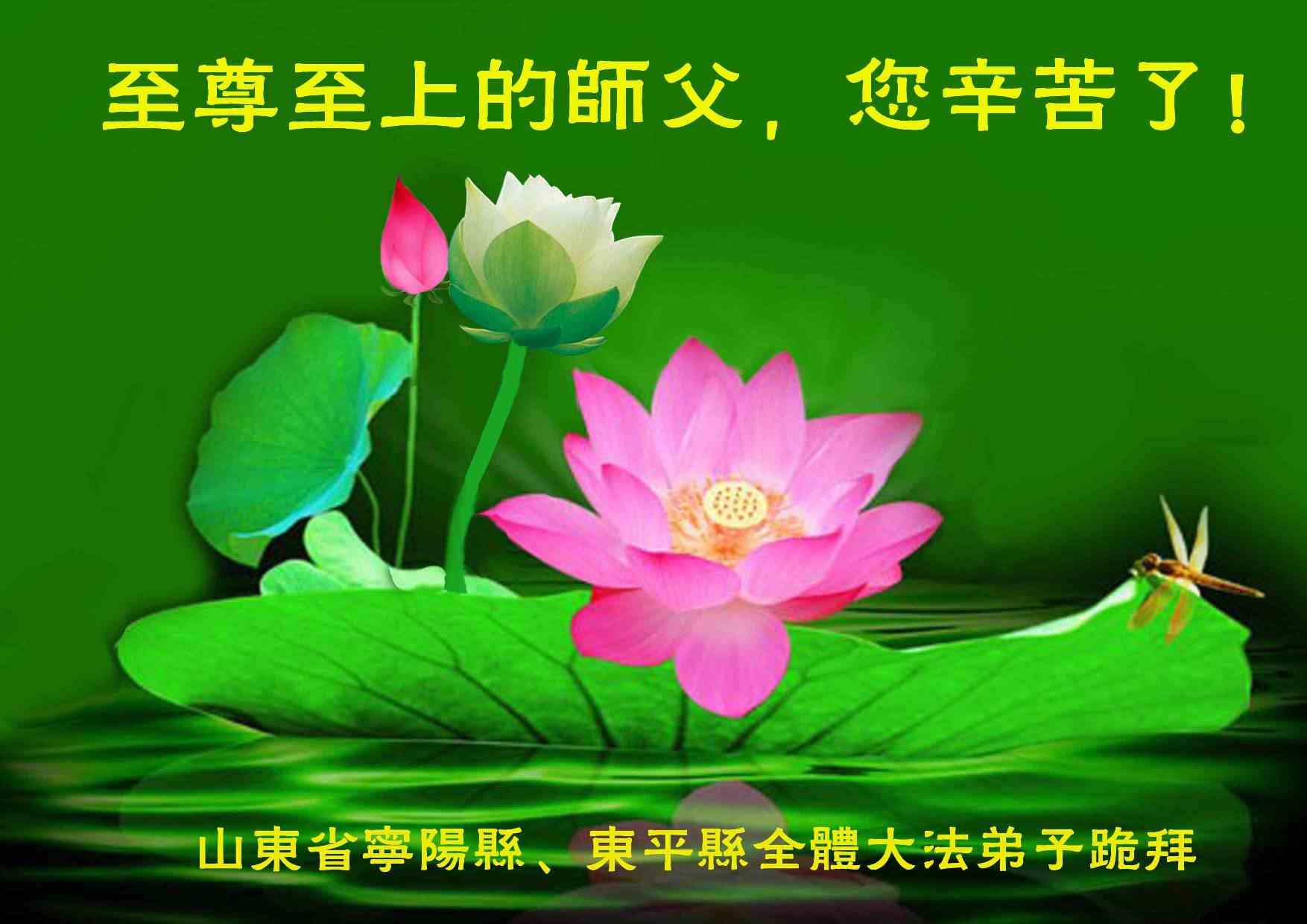 在新的一年里,弟子们一定谨记师尊教诲,整体配合,清除间隔。弟子们在最后最后的时间里,一定不能放松,更要多学法、学好法,精進实修,向内找,彻底破除旧势力的一切安排,全面解体中共邪党残余的邪恶势力及邪恶因素对大法和大法弟子的干扰迫害,整体提高、整体升华,做好弟子们应做的三件事,救度更多的众生,不负师尊的重望,不忘众生重托,兑现弟子的洪誓大愿,圆满随师还。弟子们盼望早日与师尊团圆!合十 山东大法弟子恭祝师尊元旦快乐!新年好!