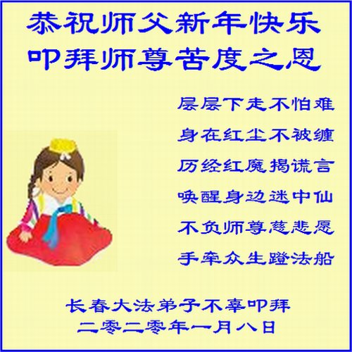 恭祝师尊新年好! 师父慈悲天地间 为了世人能得救 劳心凡间天下事 救度法徒返天庭 弟子修行师庇护 除尽邪恶挥手间 弟子助师灭邪灵 揭穿谎言丑面目 解体邪党宇宙明 放下执着随师还 叩拜师尊新年好 吉林省长春市大法弟子敬上 二零二零年一月十三日 吉林省长春市大法弟子祝师尊新年快乐!