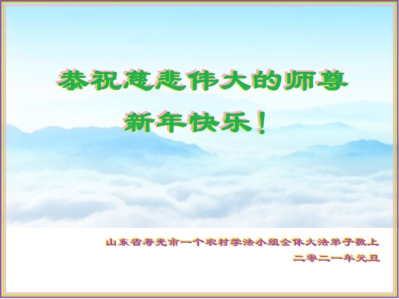 尊敬的师父您好!我们是山东平度农村大法弟子,在此新年到来之际,敬祝师父新年快乐!在新的一年里,我们努力做好三件事,讲清真相,救度众生。 黑龙江省大庆农村大法弟子恭祝慈悲伟大的师尊新年快乐!
