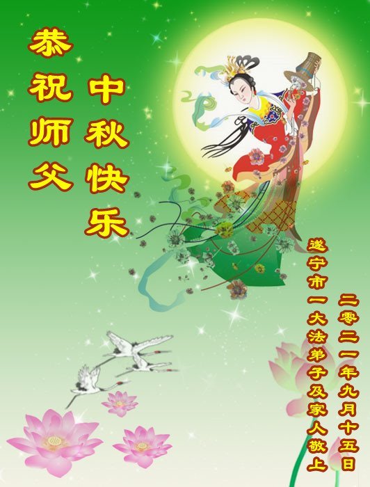 恭祝师尊中秋快乐! 仰望一轮皓月,与师尊同庆中秋,叩谢师尊救度之恩,救世人兑誓约,修炼路不停。 四川省乐山市四人学法小组大法弟子敬上 四川省遂宁市俩大法弟子恭祝师尊中秋快乐!