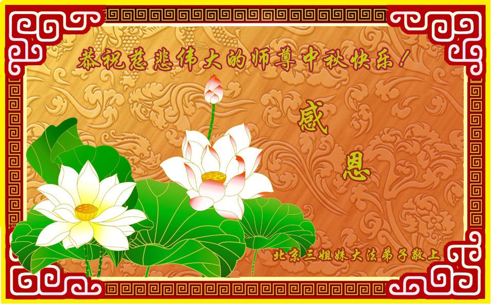 师尊:您辛苦了!您为弟子、为众生操尽了心,每每想起这一切都成为弟子精進的动力。弟子牢记使命,弟子愿师尊多一些欣慰、少一些操劳。弟子叩拜师尊! 北京一大法弟子及全家恭祝师尊中秋节快乐!