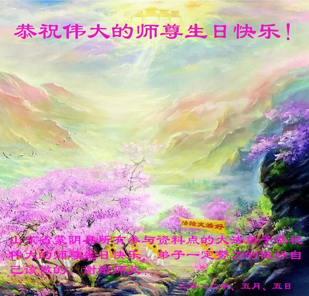 山东临沂蒙阴一大法弟子向师尊问好!普天同庆同祝同颂世界法轮大法日!遥祝慈悲伟大的师尊生日快乐!