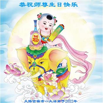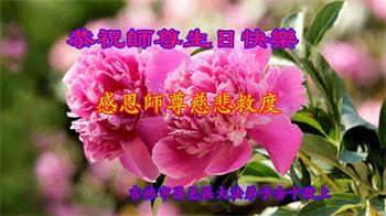 师尊您辛苦了!今年的五月十三日,在这普天同庆的伟大节日里,弟子无限感恩伟大师尊的慈悲救度!为自己能修炼法轮大法深感殊荣。我今年六十九岁了,我的女儿见证了大法的超常与神奇,并亲身受益。所以支持大法,感恩师尊。在剩下不多的修炼机缘中,请师尊放心,弟子一定要更加精進,修好自己多救人,继续走好最后修炼路,以报师恩。 大陆吉林市一大法弟子恭祝师尊生日快乐!庆贺世界法轮大法日!