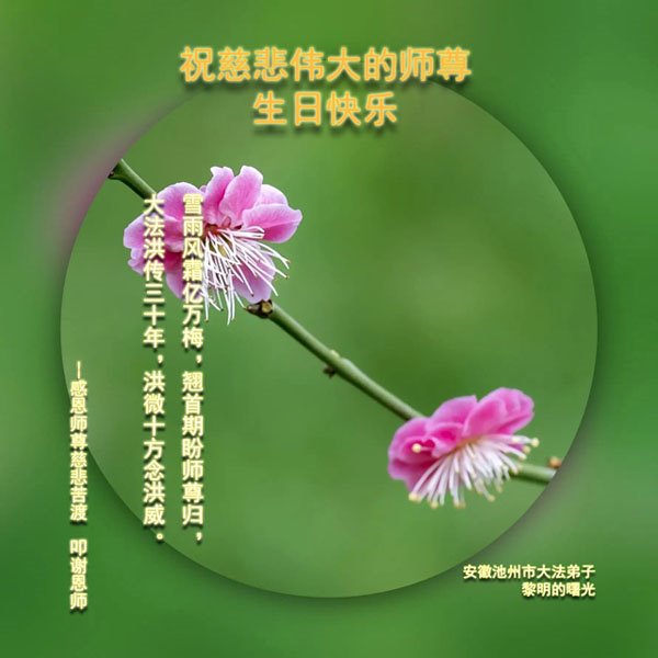 感恩师尊的慈悲救度!弟子谨记师尊教诲,修好自己,多救人,兑现誓约,完成使命,圆满随师还。 安徽省安庆市俩大法弟子恭祝师尊华诞暨世界法轮大法日!