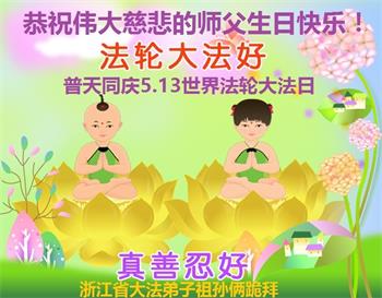 普天同庆5.13世界法轮大法日! 弟子跪拜师父救度之恩! 浙江省大法弟子祖孙俩跪拜 浙江省温州一家三代大法弟子恭祝慈悲伟大的师尊生日快乐!恭贺世界法轮大法日!