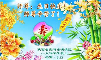 陕西省宝鸡市大法弟子恭祝慈悲伟大的师尊生日快乐!庆祝“五一三”世界法轮大法日!