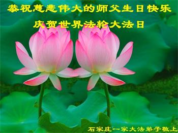 河北省石家庄大法弟子一家恭祝慈悲伟大的师父生日快乐!庆贺世界法轮大法日!