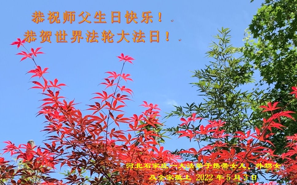 河北省石家庄长安区一家三口大法弟子恭贺五·一三世界法轮大法日暨法轮大法洪传30周年! 2022年5月2日 河北石家庄大法弟子恭祝师父生日快乐!