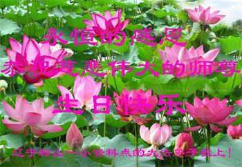 师父生日快乐!师父您辛苦了!弟子叩谢师尊! 我代表我和我的家人感恩慈悲伟大的师尊慈悲苦度。弟子想念您!弟子用尽人间的语言也无法感激师尊的慈悲苦度,唯有精進实修做好三件事以报师恩。 辽宁省阜新市三位大法弟子恭祝慈悲伟大的师父生日快乐!