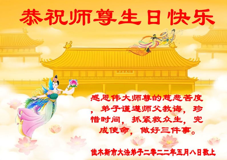 恭祝慈悲伟大的师父生日快乐! 恭贺法轮大法洪传世界三十周年! 感恩师尊慈悲救度,在宇宙走向成、住、坏、灭的最后关头,您拯救了大穹,开创了新宇,救度无量众生,在正法的最后时刻,弟子们 一定遵照您的教诲,认真学法,转变观念,实修自己,多救人,加快脚步更精進。兑现誓约,完成史前大愿。圆满随师还。 黑龙江省佳木斯市一学法组大法弟子敬上 二零二二年五月 黑龙江省佳木斯郊区一大法弟子恭祝慈悲伟大的师尊生日快乐!恭贺法轮大法日!