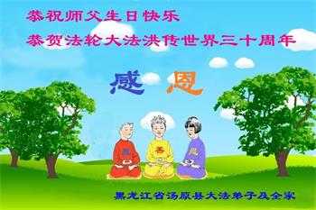 黑龙江省佳木斯市桦川县一家三位大法弟子恭祝慈悲伟大的师尊生日快乐!恭贺师尊洪传大法三十周年!