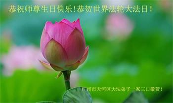 广东省广州市天河区一家三口大法弟子恭贺世界法轮大法日!恭祝慈悲伟大的师尊生日快乐!