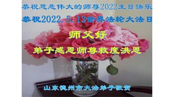 【明慧网二零二二年五月十四日】 山东省德州市陵城区一学法小组大法弟子恭贺师尊华诞暨世界法轮大法日!