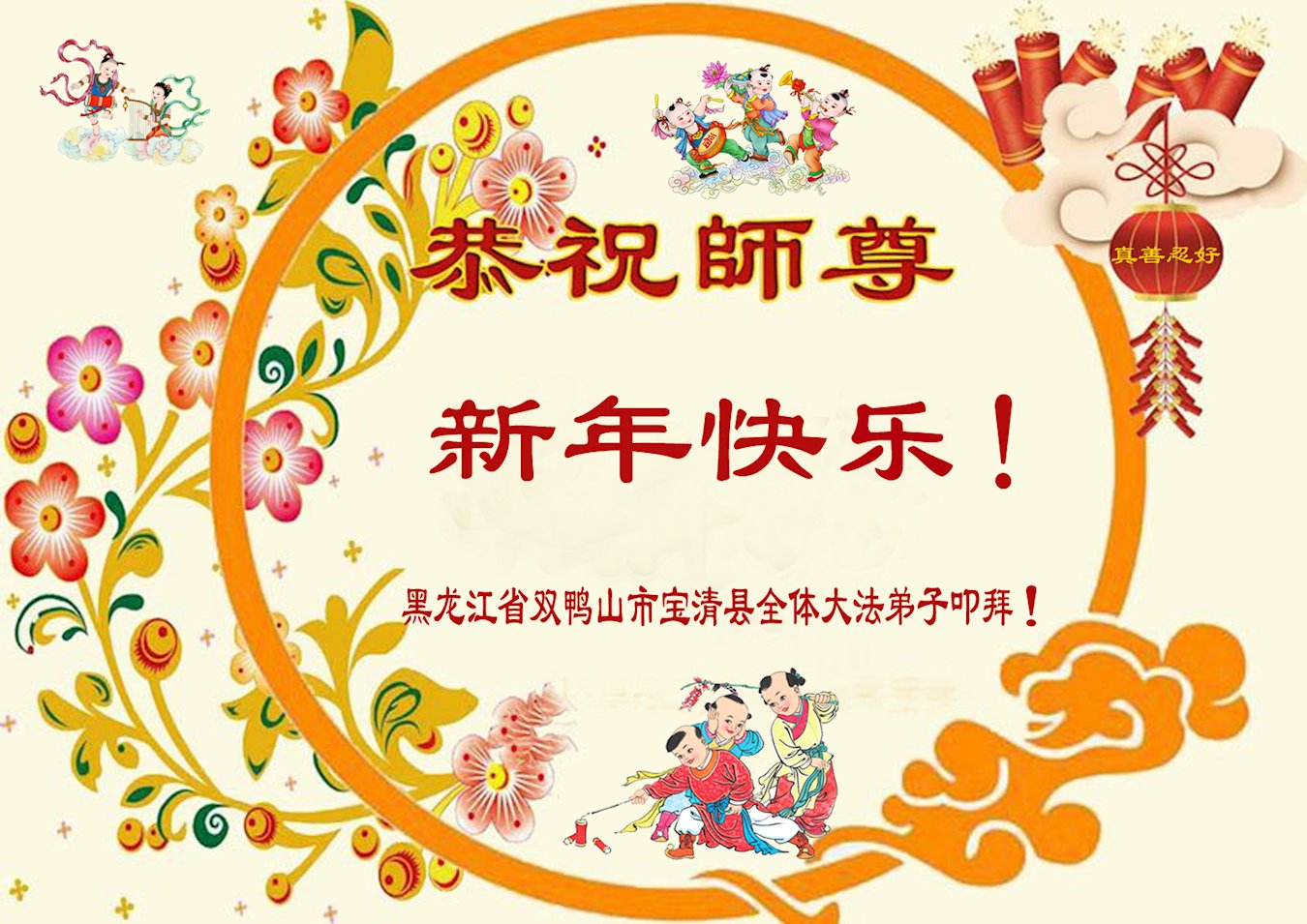 【明慧网二零二三年一月十九日】 黑龙江省双鸭山市宝清县全体大法弟子恭祝慈悲伟大的师尊新年快乐!