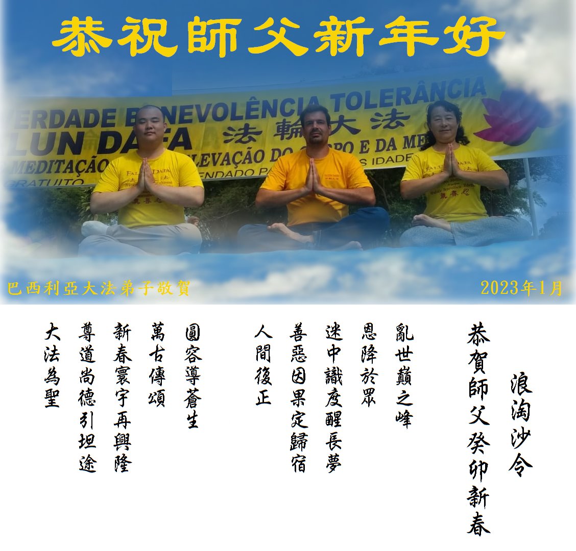 新的一年,请师父放心,弟子会继续抓紧时间,再精進,做好三件事多救人,不辜负师父的慈悲苦度与众生的期盼!感恩师父!叩拜师父! 加拿大红鹿市大法弟子及家人跪拜 二零二三年一月二十二日 巴西圣保罗第一炼功点大法弟子恭祝慈悲伟大的师父过年好!