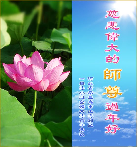 我们俩携全家恭祝师父新年快乐!在新的一年里听师父的话,继续助师正法,救度众生。 河北省秦皇岛市山海关区一学法小组大法弟子携全体家人恭祝慈悲伟大的师尊过年好!