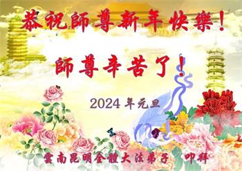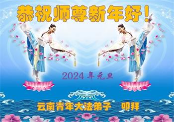 历史即将進入二零二四年之际,云南全体大法弟子及其家人向伟大慈悲的师父表示新年的问候!恭祝师尊新年好!新年快乐!师尊辛苦了!感恩师尊慈悲苦度! 在新的一年里,我们云南大法弟子要继续按照师尊的要求,学好法、多学法,实践法,做好大法弟子的三件事,向民众多讲真相、讲好真相,多救人,兑现好自己的史前誓约。让师父放心! 师尊正法四六秋 众神重塑天地留 大法法光照寰宇 师尊洪恩荡天穹 云南青年大法弟子恭祝师尊新年快乐!