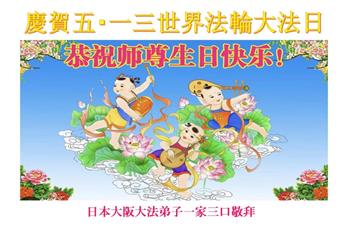 感谢师尊慈悲苦度!精進谢师恩! 东京一法轮大法弟子敬上 2023年5月 日本大阪大法弟子一家三口恭祝师尊生日快乐!庆贺世界法轮大法日!