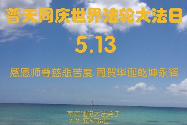 恭贺世界法轮大法日! 恭祝师尊生日快乐! 恭贺2023世界法轮大法日!普天同庆之时,更觉精進实修,同化大法,多救世人的重要和光荣,更觉义不容辞。 江苏省镇江市句容市一大法弟子恭祝慈悲伟大的师尊生日快乐!