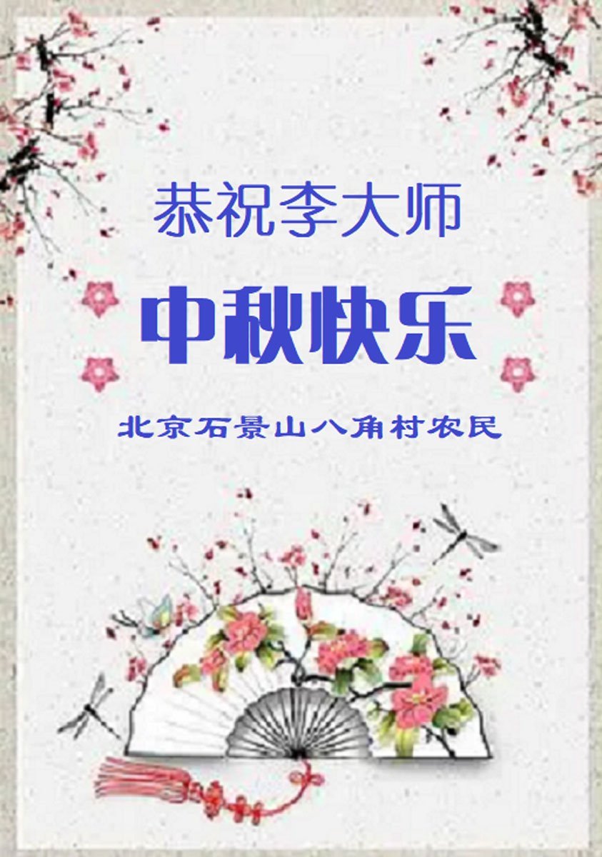 恭祝李洪志先生中秋佳节安康吉祥!大法如皎皎明月普照中华,为黑夜中前行的中国人照耀前方的路! 大陆一人权律师敬上 北京市昌平农村一明真相世人全家三口恭祝师父中秋节快乐!
