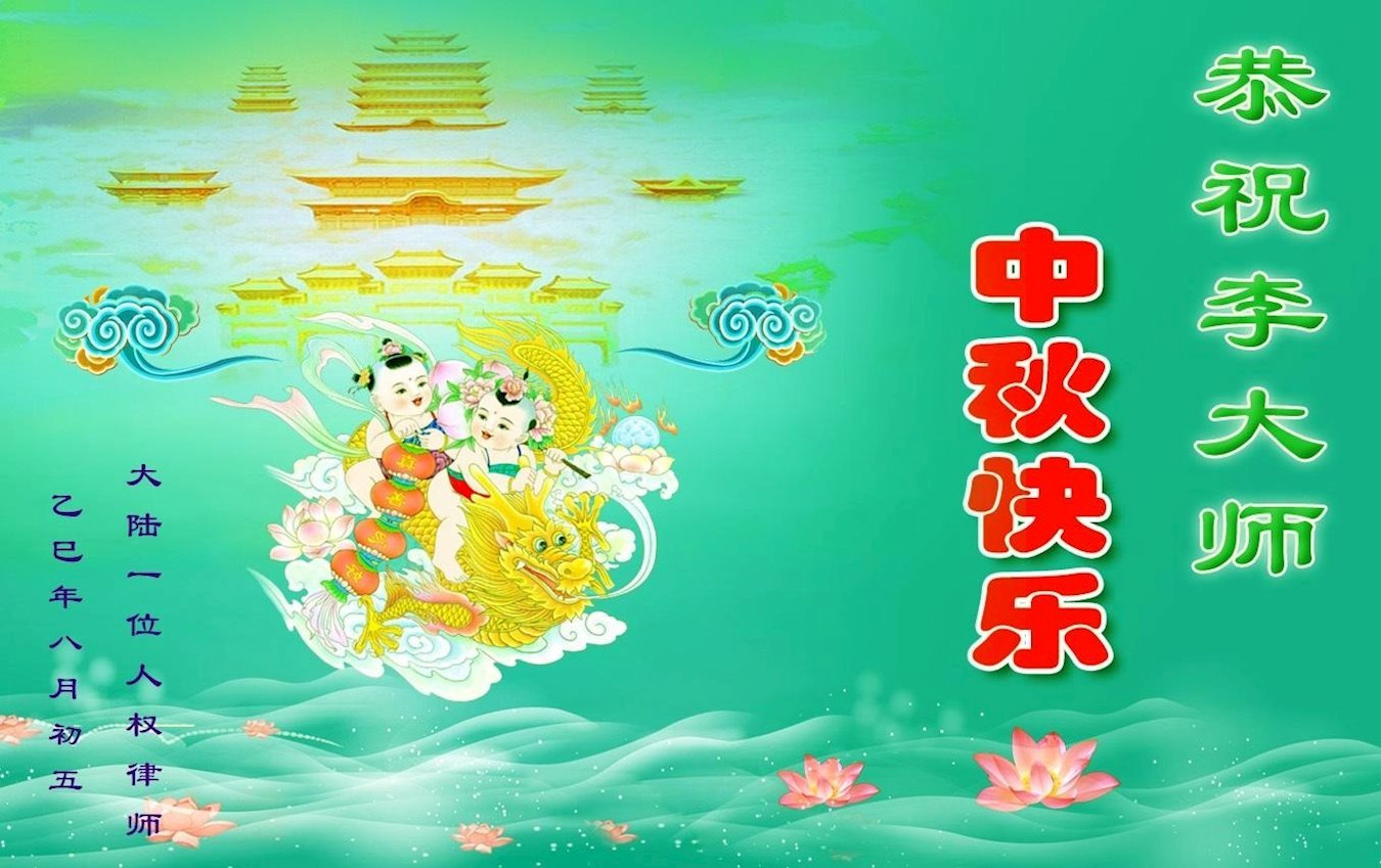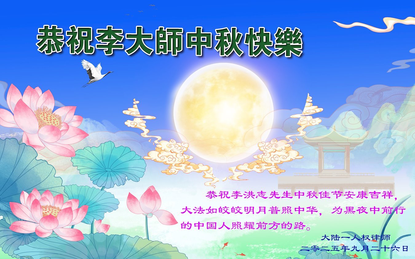 恭祝李洪志大师中秋快乐!中秋佳节即将到来,在此祝愿李大师中秋快乐!愿中国人尽早抛弃邪党,过上真正属于人类的正常生活。愿大法弟子遭受的迫害尽快结束,能够正常的修炼,从而更好的福益于全社会、全人类。 大陆一人权律师恭祝李大师中秋快乐!