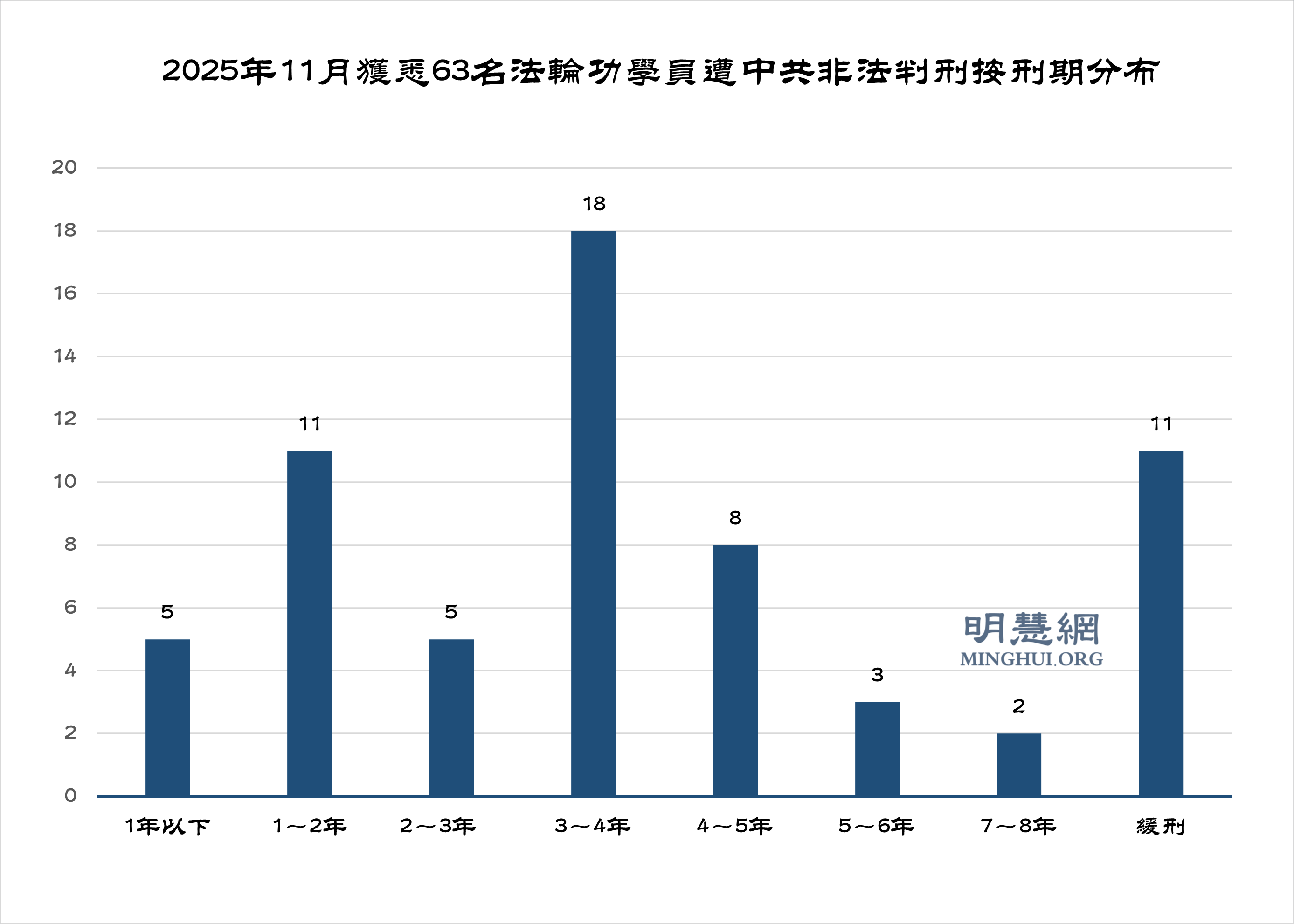 图2:2025年11月获悉63名法轮功学员遭中共非法判刑按刑期分布 |