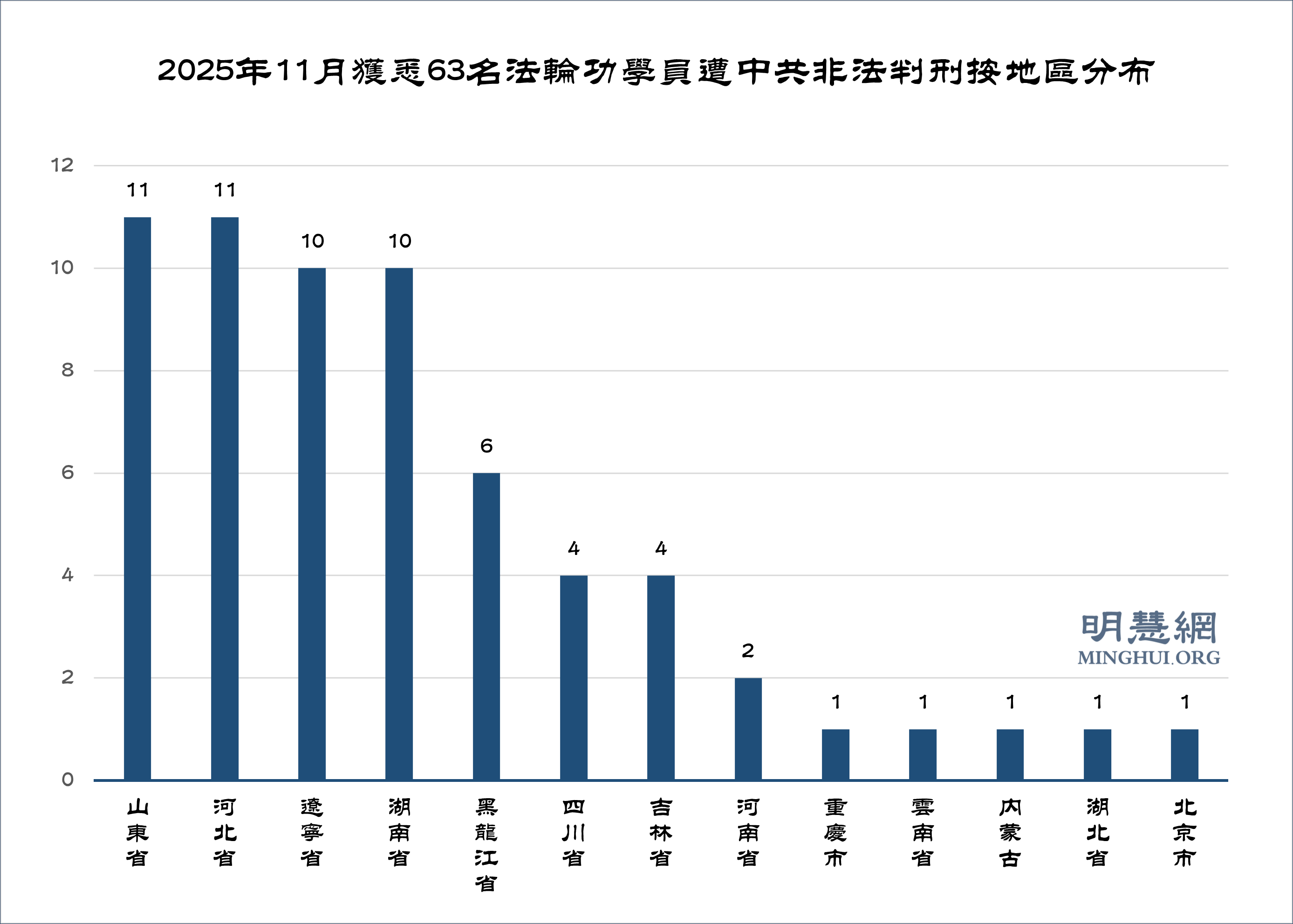非法判刑迫害分布于中国大陆的至少13个省、自治区、直辖市。迫害最严重地区依次为:山东省11人,河北省11人,辽宁省10人,湖南省10人,黑龙江省6人,四川省4人,吉林省4人。 迫害案例: 1、湖南常德市十名法轮功学员遭非法判刑 湖南常德市十名法轮功学员王晓群、李冬枝、李伟云、尹红、刘先菊、姚洲、杨碧琼等,被非法构陷近两年,二零二五年十一月十二日被桃源县法院非法判刑如下: 王晓群(女,76岁)被非法判刑五年、勒索罚金8千元; 李冬枝被非法判刑四年、勒索罚金6千元; 李伟云、尹红被非法判刑三年九个月、勒索罚金6千元; 刘先菊、姚洲被非法判刑三年六个月、勒索罚金5千元; 杨碧琼(女,73岁)被非法判刑三年、勒索罚金5千元; 杨桂明被非法判刑两年六个月缓刑3年、勒索罚金4千元; 尤楚云被非法判刑一年缓刑一年六个月、勒索罚金2千元; 董明芳被非法判刑九个月缓刑一年、勒索罚金1千5百元。 二零二三年十一月三十日,常德市公安警察、国保、国安人员等开始非法抓捕法轮功学员,从早晨五点多到七点多,时间不等,他们到法轮功学员家敲门,非法抄家再抓人,大概有三、四十位法轮功学员被绑架,六人被劫持到拘留所,其中两人因血压高回家,另外四人分别被非法拘留十天、十五天后回家。其余二十多名法轮功学员被非法关押在洗脑班(地址:常德市武陵区青年路1559号新安学校)。王晓群、李冬枝、李伟云、尹红、刘先菊、姚洲、杨碧琼等十名法轮功学员,被非法构陷近二年,二零二五年十一月十二日被桃源县法院非法开庭。 2、黑龙江大庆女教师段晓荣被枉判七年、勒索六万元 大庆市让胡路区61岁的法轮功学员段晓荣老师,二零二五年六月二十四日带她八旬母亲晒太阳后去买菜,被便衣警察绑架,非法关押在大庆市第二看守所构陷。十月十五日,她被大庆让胡路区法院非法开庭,近日得知被非法判刑七年、并勒索六万元罚款。段晓荣将上诉。 在庭审现场,段晓荣表明信仰法轮功是受国家保护的,拒绝承认自己有罪!从判决书中看,段晓荣所谓“口供”部份被非法恶意篡改。段晓荣的母亲得知女儿被绑架迫害后健康恶化,于九月末悲愤离世。 段晓荣,一九六四年十一月生。她是大庆乘风第四小学教师,住大庆市让胡路区东湖上城。她炼法轮功之前,身体患有乳腺增生、神经性震颤、气管炎、角膜炎、痔疮、咽炎,关节炎等疾病;一九九八年十一月开始修炼法轮功,各种疾病不治而愈,变得更善良、更加宽容、更加真诚,在工作中领导让她干什么就干什么,在教学中对待学生真诚耐心,学生家长为了表达感谢送礼物、她都婉言谢绝,家长都很感动。 二零二二年四月二十日,大庆市警察悍然在一天之内绑架了二十多名法轮功学员,人们议论纷纷,指责警察不务正业,浪费纳税人的钱财专干伤天害理的事。有位领导说;病毒没走,警察又来了。当天早晨六点半,段晓荣被大庆公安铁人分局警察敲门绑架,并被非法抄家,先后去了十二个警察,翻了一上午,抢劫走电脑、打印机、真相手机等私人财物。同时,三、四个警察敲门闯入段晓荣女儿家非法抄家抢劫,并将她劫持到铁人分局。母女二人于当天回家。 二零二五年六月二十四日下午,段晓荣被绑架。段晓荣被非法拘禁在大庆第二看守所,被构陷到让胡路区检察院、法院。十月十五日上午九点,段晓荣在大庆让胡路区法院刑庭被非法开庭,公诉人是让胡路区检察院朱璇、庭长是让胡路区法院二级法官张欣乐。十一月五日,段晓荣女儿接到让胡路区法院法官张欣乐电话,要求段晓荣写“三书”,并称“审判”结果将于近期内完成。段晓荣拒绝签署所谓的“三书”。十一月十九日下午,段晓荣女儿接到大庆市让胡路区法院电话,通知“判决书”下达,段晓荣被非法判刑7年并处6万元罚款。 3、曾遭十一年冤狱折磨 四川成都钟芳琼又被枉判五年 成都市法轮功学员钟芳琼女士,二零二四年七月七日被成都市公安局新都分局大丰南派出所警察绑架,被非法关押在成都市看守所构陷,二零二五年十一月十八日被新都法院非法判刑五年、勒索罚款一万元。钟芳琼本人已经提出上诉。 钟芳琼,现年60岁,原籍四川省简阳市云龙镇杨鸣村七社。19岁时,她带着十五元钱到成都闯荡。数年后,钟芳琼成为拥有资产七十万元的个体运输专业户。尽管生意越来越好,随着年龄的增长,从六岁起就烦恼着她的右腿先天性血管瘤也越来越严重。一九九七年,经华西医科大学三十多位专家会诊,确认为是“先天性大面积海绵状肿胀型血管瘤”,国际上尚无有效治疗方法。一九九九年三月,钟芳琼开始修炼法轮大法,两个月内,血管瘤奇迹般的消失了,从此她获得新生。她内心愉悦,无比感恩法轮大法。 一九九九年七月二十日,中共邪党开始疯狂迫害法轮功后,钟芳琼多次被绑架、非法关押,一次被非法劳教、两次被非法判刑累计十一年,在派出所、看守所、洗脑班、劳教所、监狱遭受残酷迫害。在成都市女子监狱,钟芳琼拒绝“转化”,入狱半年时间,吃饭连筷子都不给,只能用手抓;有十天给的饭量只有犯人的四分之一;连买生活用品的权利都被剥夺,如厕只能捡别人用过的脏纸;上厕所被严格限制,每天早上六点起床后就一直被罚坐在一张三寸高、直径五寸的塑料凳上,一直到晚上十点,坐在板凳上强迫必须坐成军姿,时间一长,屁股被硌得大面积溃烂,脓水和裤子粘在一起,