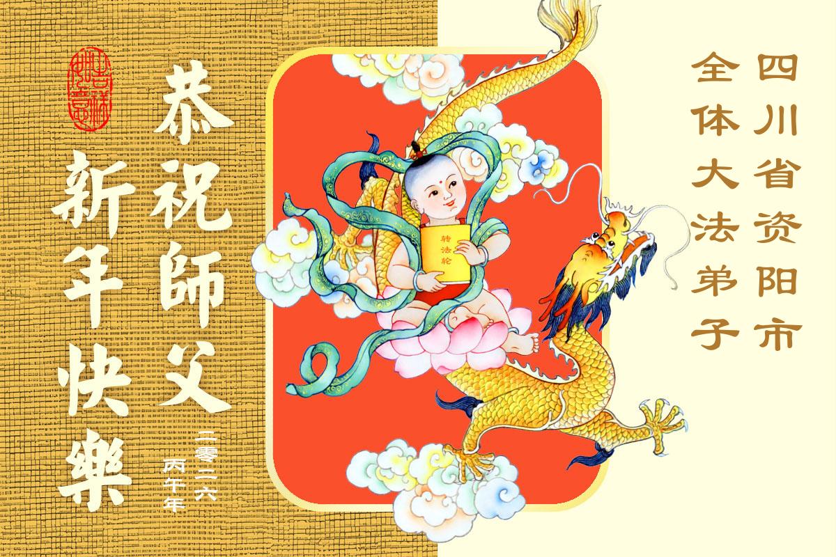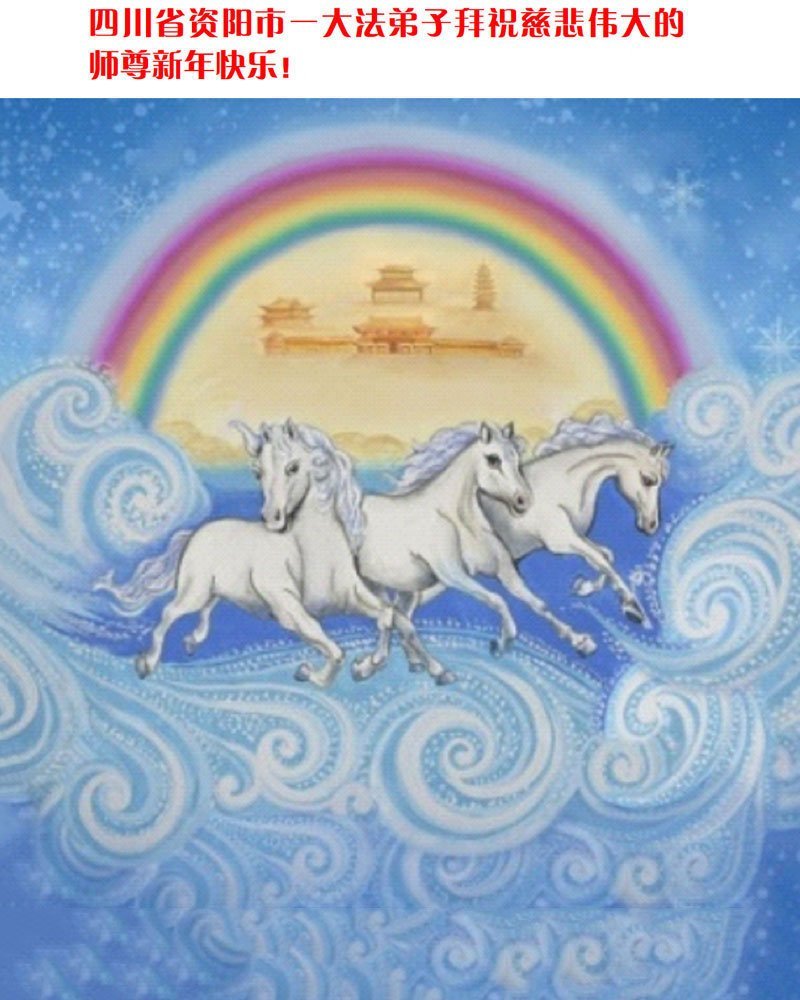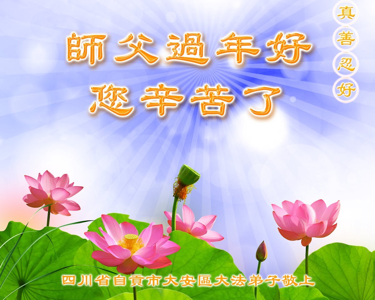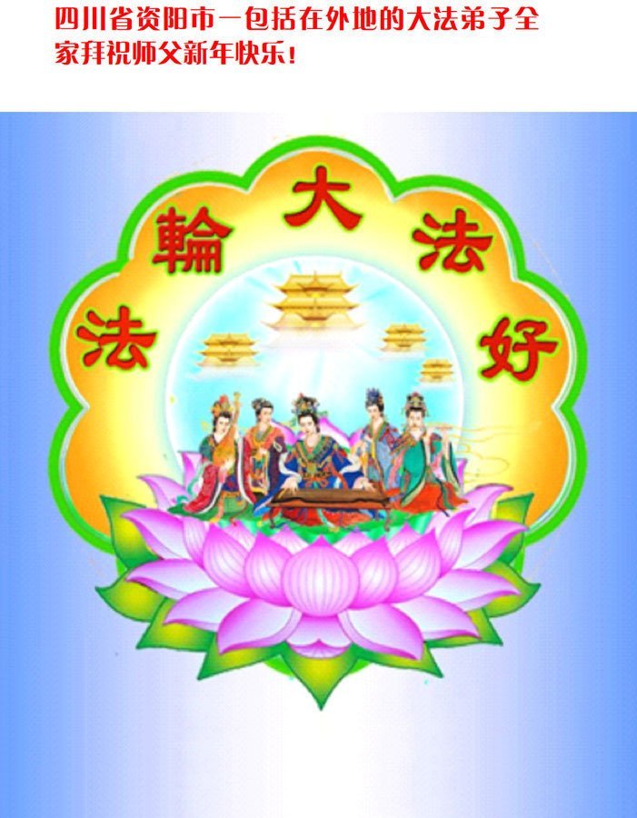 恭祝慈悲伟大的师父过年好! 四川省自贡市贡井区大法弟子敬上 四川省资阳市安岳县一家三大法弟子恭祝伟大师尊过年好!