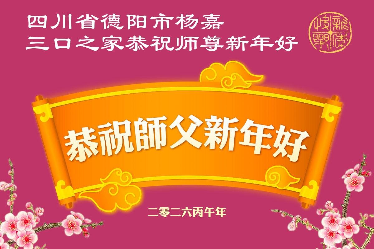 四川乐山一大法弟子与全家 二零二六年一月十四日 四川省德阳市杨嘉一大法弟子全家三口恭祝师父新年好!