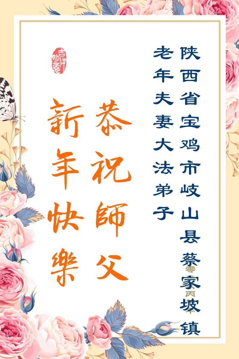 陕西省宝鸡市眉县全体大法弟子 二零二六年一月二十三日 陕西省宝鸡市岐山县蔡家坡镇老年夫妻大法弟子恭祝师父新年快乐!