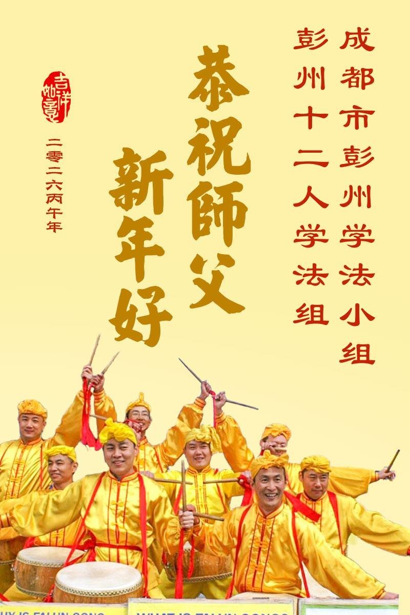 弟子恭祝慈悲伟大的师尊新年快乐!感恩师尊慈悲救度,师尊您辛苦了!法轮大法好,真善忍好! 成都市彭州二人学法组和三人学法组敬上 二零二六年一月十七日 四川省成都市彭州市十二人学法组恭祝慈悲伟大的师尊新年快乐!