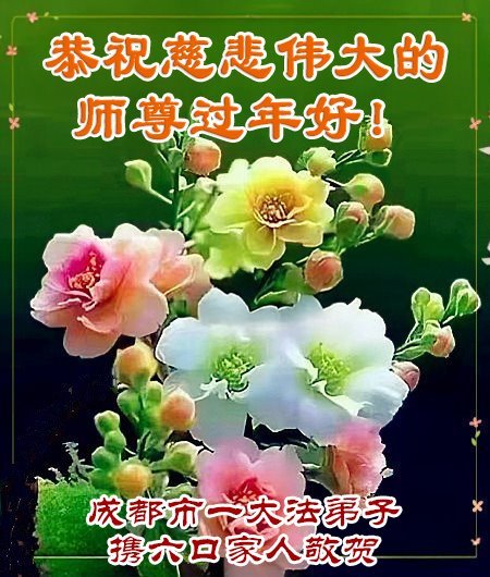 恭祝慈悲伟大的师尊新年快乐! 四川省成都市彭州市一大法弟子敬上 四川省成都市一大法弟子全家恭祝慈悲伟大的师尊新年快乐!