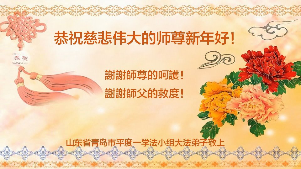 恭祝师尊新年快乐!在师父慈悲的护佑下,我们风风雨雨走过了反迫害救度众生的27个年头。不管时日长短,我们要一如继往,更加精進,做好三件事,完成历史使命报答师父的救度洪恩。 山东省菏泽市曹县全体大法弟子敬上 山东省烟台市莱阳市大法弟子恭祝师尊新年好!