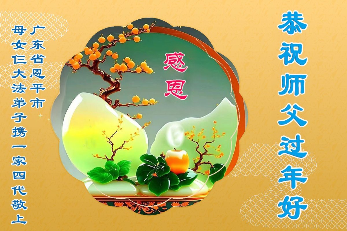 法轮大法好真善忍好! 广东省恩平市一大法弟子敬上 广东省江门市恩平市母女仨大法弟子携一家四代恭祝师父过年好!