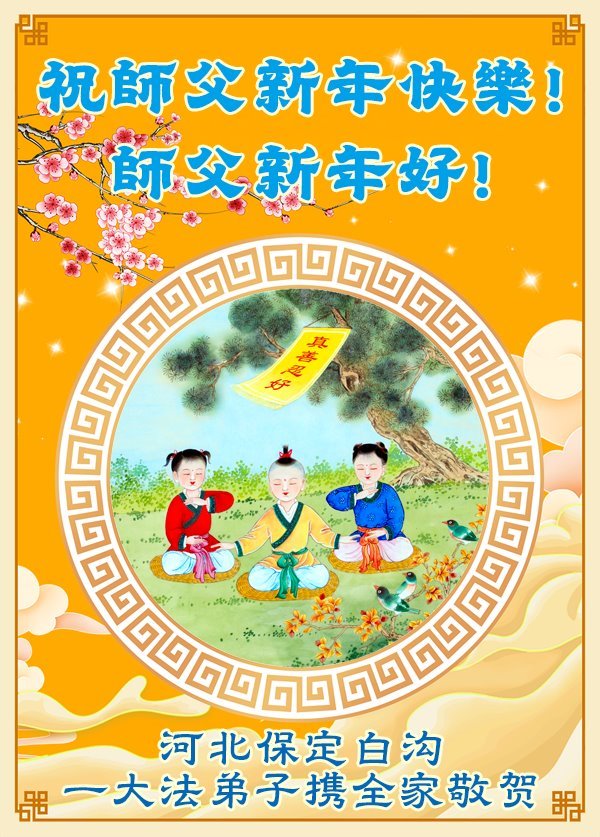 恭祝慈悲伟大的师尊新年快乐!感谢师尊救度之恩! 河北省保定市白沟镇一大法弟子携全家敬上 河北省保定市一学法小组大法弟子恭祝师尊新年快乐!